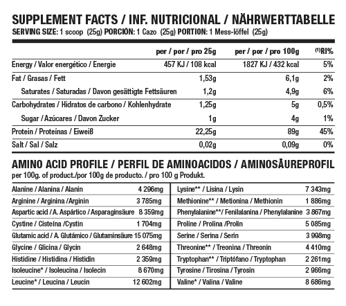 Proteïnemix (whey-eiwitisolaat, gehydrolyseerd whey-eiwitisolaat, ultra gefilterd en cross-flow wei-eiwitconcentraat), plantaardige olie (middellange keten triglyceriden MCT uit kokosolie), smaakstoffen
